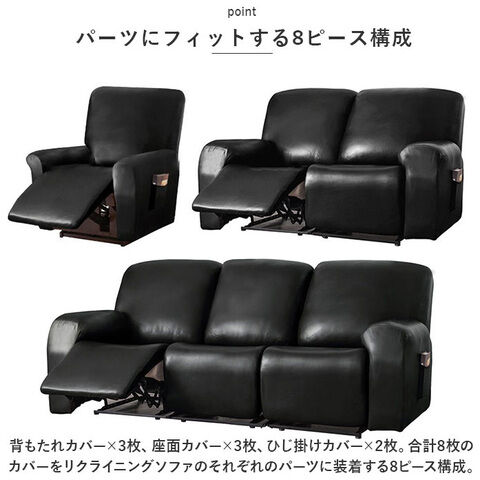 背もたれカバー×3枚、座面カバー×3枚、ひじ掛けカバー×2枚。合計8枚のカバーをリクライニングソファのそれぞれのパーツに装着する8ピース構成。