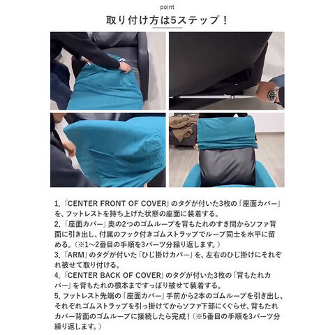 - 注意書き:【取り付け方は5ステップ! 】1.「CENTER FRONT OF COVER」のタグが付いた3枚の「座面カバー」を、フットレストを持ち上げた状態の座面に装着する。2.「座面カバー」奥の2つのゴムループを背もたれのすき間からソファ背面に引き出し、付属のフック付きゴムストラップでループ同士を水平に留める。(※1~2番目の手順を3パーツ分繰り返します。)3.「ARM」のタグが付いた「ひじ掛けカバー」を、左右のひじ掛けにそれぞれ被せて取り付ける。4.「CENTER BACK OF COVER」のタグが付いた3枚の「背もたれカバー」を背もたれの根本まですっぽり被せて装着する。5.フットレスト先端の「座面カバー」手前から2本のゴムループを引き出し、それぞれゴムストラップを引っ掛けてからソファ下部にくぐらせ、背もたれカバー背面のゴムループに接続したら完成! (※5番目の手順を3パーツ分繰り返します。)海外輸入品のため、商品によってはパッケージや説明書が、英語や中国語表記となっている場合があります。商品を安価でご提供させていただくため、輸入時のパッケージのままでのお届けとなります。予めご了承くださいませ。商品の写真はできる限り実物のお色に近づけるように加工しておりますが、お使いのモニター設定、お部屋の照明などにより、実際の商品と異なる場合がございます。商品の生産時期などにより、付属品(ボタン、ファスナー、タグ、パッケージなど)のデザインや仕様の一部が変更になる場合がございますが、予めご了承くださいませ。商品や個体差などにより、表記と若干異なる場合がございますが、予めご了承くださいませ。輸入品のため、糸の継ぎ目や縫製等が甘い部分、糊跡等が生じる場合がございますが、予めご了承くださいませ。生地の特性上、やや匂いが強く感じられるものもございます。数日のご使用や陰干しなどで気になる匂いはほとんど感じられなくなります。お手入れなどはタグなどの表記をご確認ください。配送の方法によっては、商品に多少のシワ等ができる場合がございますが、出来る限りお客様にリーズナブルな価格帯でご提供するためです。ご了承くださいませ。採寸方法の違いにより、多少の誤差がある場合がございます。