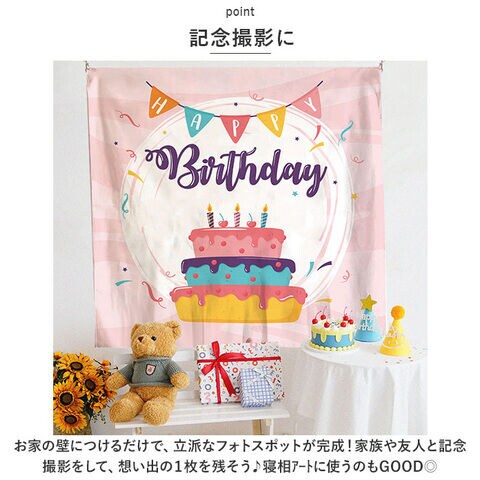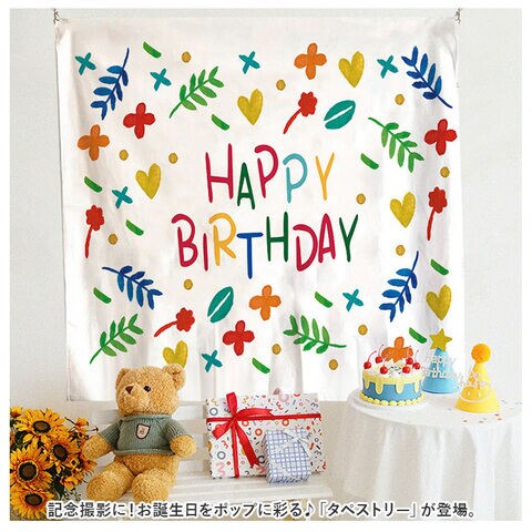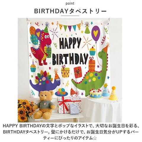 HAPPY BIRTHDAYの文字とポップなイラストで、大切なお誕生日を彩る、BIRTHDAYタペストリー。壁にかけるだけで、お誕生日気分がUPするパーティーにぴったりのアイテム☆
