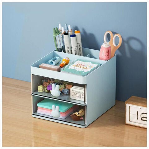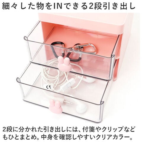 ・2段に分かれた引き出しには、付箋やクリップなどもひとまとめ。中身を確認しやすいクリアカラー。
