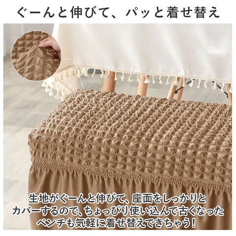 タテ・ヨコに程よく伸縮するストレッチ素材が、ダイニングベンチやロングスツールなど、背もたれのないタイプの長椅子にぴったりフィット!