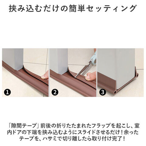 ・「隙間テープ」前後の折りたたまれたフラップを起こし、室内ドアの下端を挟み込むようにスライドさせるだけ! 余ったテープを、ハサミで切り離したら取り付け完了!