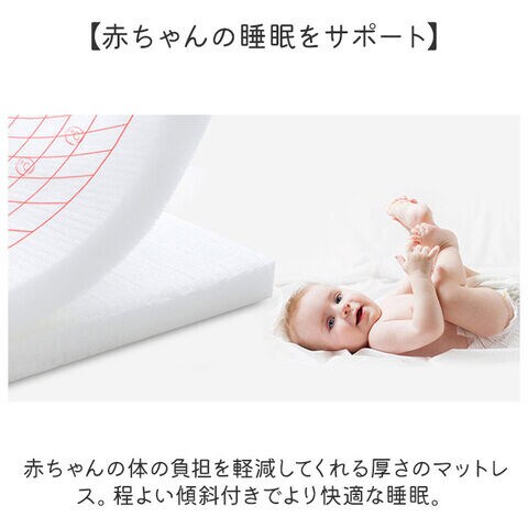 赤ちゃんの体の負担を軽減してくれる厚さのマットレス。程よい傾斜付きでより快適な睡眠。