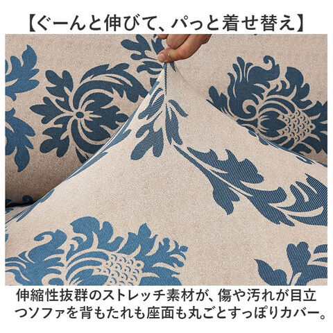 伸縮性抜群のストレッチ素材が、傷や汚れが目立つソファを背もたれも座面も丸ごとすっぽりカバー。