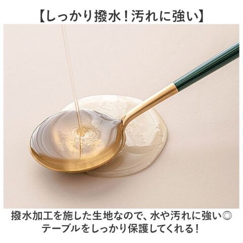 撥水加工を施した生地なので、水や汚れに強い◎テーブルをしっかり保護してくれる!