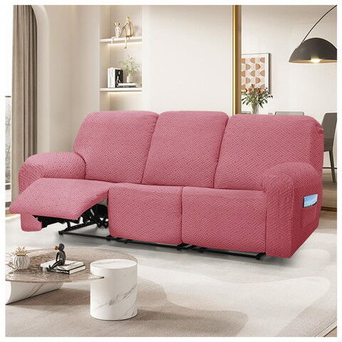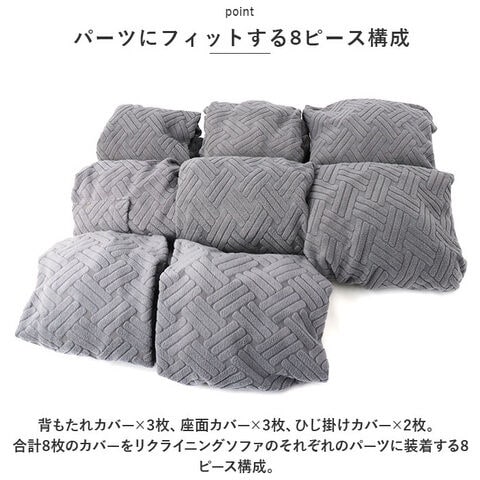 背もたれカバー×3枚、座面カバー×3枚、ひじ掛けカバー×2枚。合計8枚のカバーをリクライニングソファのそれぞれのパーツに装着する8ピース構成。
