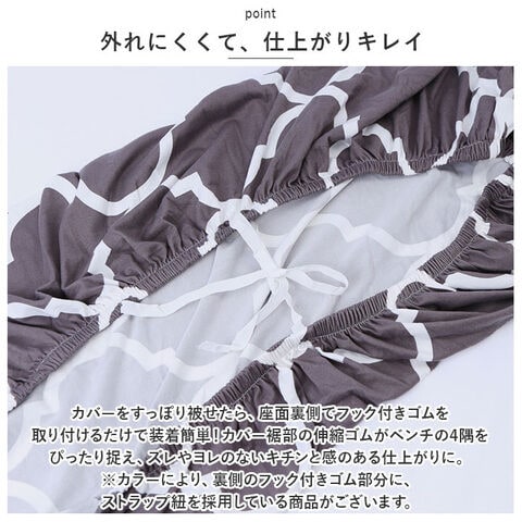 カバーをすっぽり被せたら、座面裏側でフック付きゴムを取り付けるだけで装着簡単! カバー裾部の伸縮ゴムがベンチの4隅をぴったり捉え、ズレやヨレのないキチンと感のある仕上がりに。(※カラーにより、裏側のフック付きゴム部分に、ストラップ紐を採用している商品がございます。)