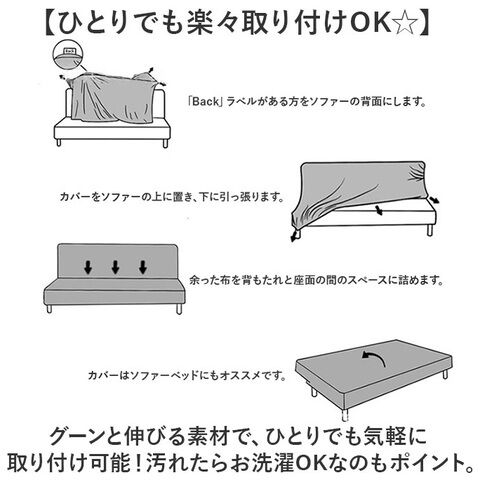 グーンと伸びる素材で、ひとりでも気軽に取り付け可能! 汚れたらお洗濯OKなのもポイント。