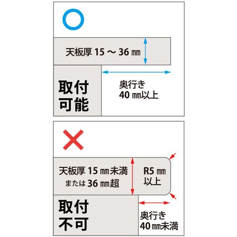◆天板厚み15~36mm、設置箇所奥行き40mm以上のデスクに取り付け可能です。