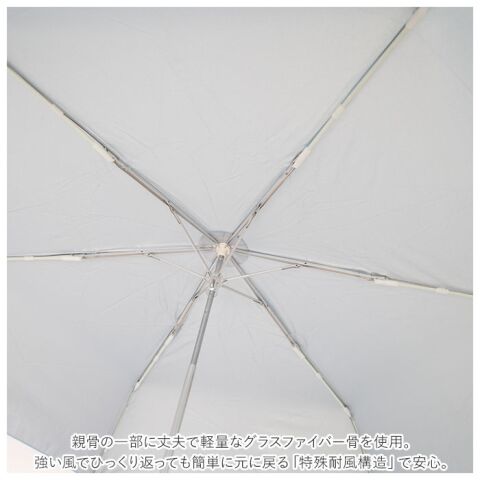 ◆親骨の一部に丈夫で軽量なグラスファイバー骨を使用。さらに、強い風でひっくり返っても簡単に元に戻る「特殊耐風構造」で安心。