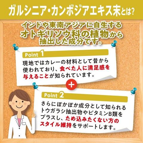 ◆ガルシニア・カンボジアの抽出エキスに、トウガラシエキスとビタミンB1、B2、B6をプラス。じょうずに体脂肪を減らしたい方に。
