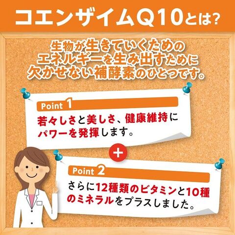 ◆健康維持に欠かすことのできない12種類の「ビタミン」と10種類の「ミネラル」に、若々しさや元気をサポートする「コエンザイムQ10」を配合したオールインワンの手軽なサプリメント。