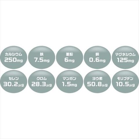 ■成分・原材料:マルチミネラル1日3粒総重量(=内容量)1350mgあたりカルシウム250mg、鉄7.5mg、亜鉛6.0mg、銅0.6mg、マグネシウム125mg、セレン30.2μg、クロム28.3μg、マンガン1.5mg、ヨウ素50.8μg、モリブデン10.5μg