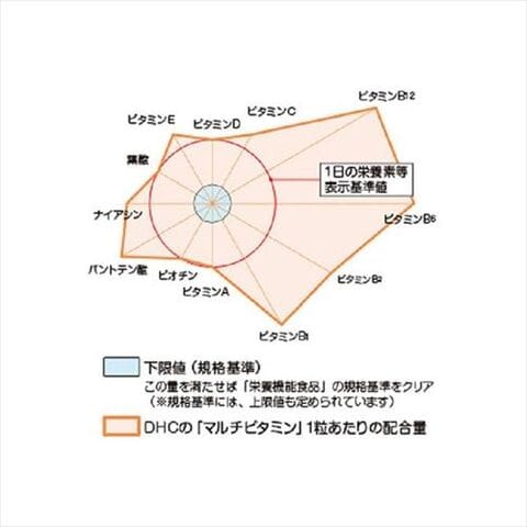 マルチビタミン1日1粒総重量525mg(内容量350mg)あたりナイアシン15mg、パントテン酸9.2mg、ビオチン45μg、β-カロテン〈ビタミンA効力1,500IU〉5400μg、ビタミンB1 2.2mg、ビタミンB2 2.4mg、ビタミンB6 3.2mg、ビタミンB12 6μg、ビタミンC 100mg、ビタミンD<ビタミンD3>〈200IU〉5μg、ビタミンE(d-α-トコフェロール)10mg、葉酸200μg、ビタミンP 20mg