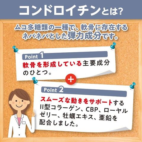 ■主要原材料:ムコ多糖タンパク(コンドロイチン硫酸含有)、鶏軟骨抽出物(II型コラーゲン、コンドロイチン硫酸含有)、乾燥ローヤルゼリー、カキエキス末、亜鉛酵母、濃縮乳清活性たんぱく(乳由来)
