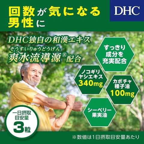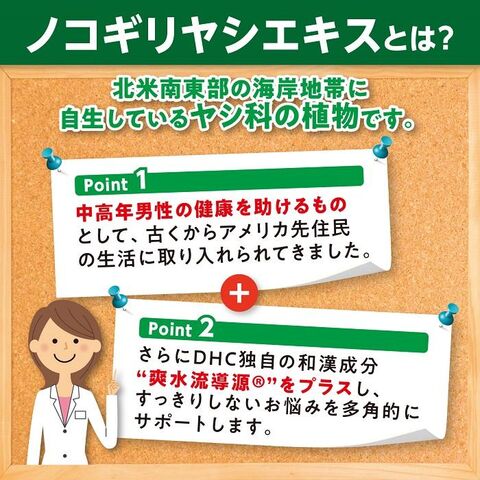◆中高年男性の気になる頻度を整えるなどの働きがあることで知られるノコギリ椰子エキスに、DHC独自配合の和漢エキスや、パワーをより高めるカボチャ種子油といった多彩な成分を配合。