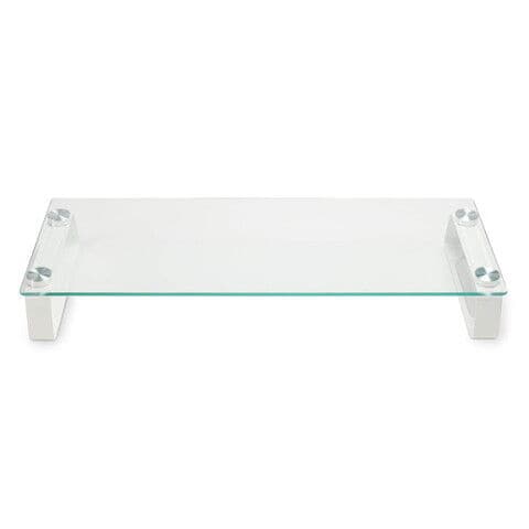 透明な強化ガラスの天板に白いメタルフレームのシンプルなデザインなので、どんなデスクにもマッチし、