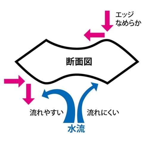 リア側に重心が寄っているとフォール時に水平姿勢ではなくなるのでは? と思われるかもしれませんが、これも窪み部全体で水を受けることで水平フォールを可能にしています。