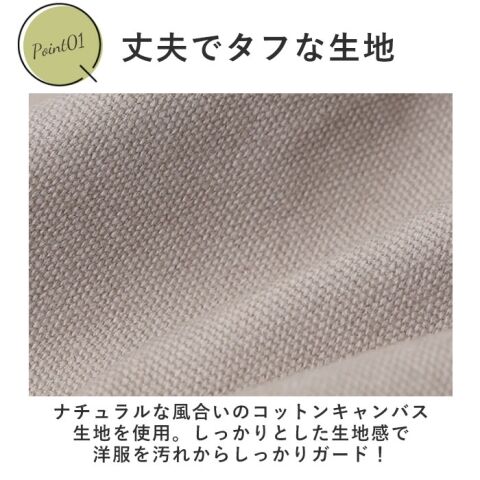 ◆ナチュラルな風合いのコットンキャンバス生地を使用。しっかりとした生地感で、洋服を汚れからしっかりガード!