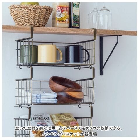 下部のリングフックを使って、横幅が同じサイズのバスケットを連結! クロスやマグなどを、取り出しやすく収納できて便利。