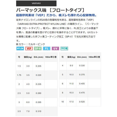 バリバス バーマックス磯 フロートタイプ 150m ミルキーピンク(2.5号/5.0kg) VARIVAS ナイロンライン 道糸 バーマックスイソ フロートタイプ 150m(2.5ゴウ/5.0kg) 【返品種別B】