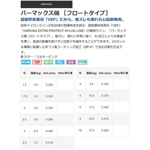 バリバス バーマックス磯 フロートタイプ 150m ミルキーピンク(3号/6.0kg) VARIVAS ナイロンライン 道糸 バーマックスイソ フロートタイプ 150m(3ゴウ/6.0kg) 【返品種別B】