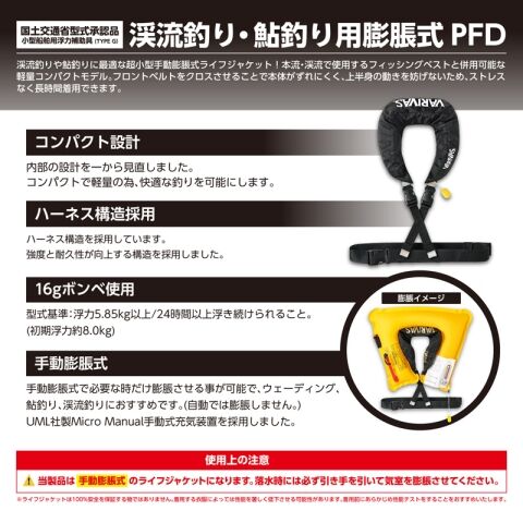 【使用上の注意】当製品は手動膨脹式のライフジャケットになります。落水時には必ず引き手を引いて気室を膨脹させてください。