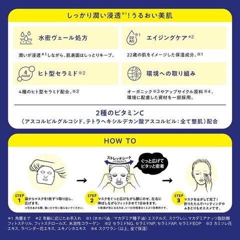 *1 使用時間目安 *2 角質まで *3 年齢に応じたお手入れ *4 (ホホバ油/マカデミア種子油)エステルズ、スクワレン、マカデミアナッツ脂肪酸フィトステリル、フィトステロールズ、水溶性コラーゲン *5 セラミドNG、セラミドNP、セラミドAP、セラミドEOP(以上、全て保湿) *6 アスコルビルグルコシド、テトラヘキシルデカン酸アスコルビル(全て整肌)