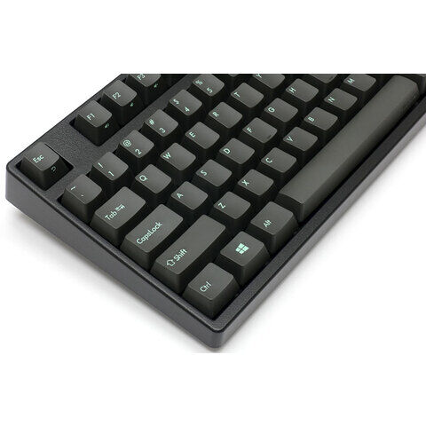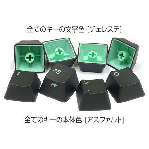 マットブラック色のフレームにアスファルト地のキーキャップを搭載したキーボード。フレームとキーキャップに統一感を持たせ、鮮明なチェレステ色の文字はキーボードに高級感をもたらします。