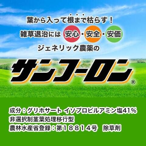 サンフーロン液剤の有効成分は、グリホサートイソプロピルアミン塩41%一年生雑草から多年生雑草、ススキ・ササ類まで、葉から入って根まで枯らすので、除草効果が長く確実です。土に落ちると除草効果がなくなるので、散布後でも、種まきや、苗の植付けが出来ます。果樹の下草枯らしにも、安心して使用出来ます。500ml 1本で約1反・1000 分、多くの作物に農薬登録がある上に、ジェネリック農薬だから、価格も安くなっています。(ジェネリック農薬とは、ジェネリック医薬品と同様、先発品と成分・効果が同じで、消費者の価格面での負担を軽減する、農薬のことです。)