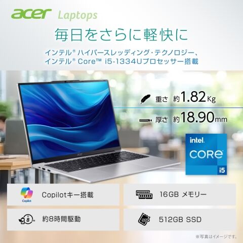 ノートパソコン Acer|エイサー 16型 ノートパソコン Aspire Lite(Core i5 1334U/メモリ 16GB/SSD 512GB/Windows 11Home)ライトシルバー AL16-52P-F56Y 【返品種別A】