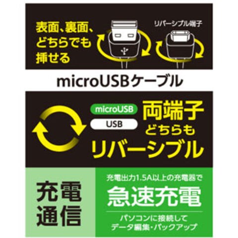◆USB端子側、microUSB端子側、どちらも表面、裏面に関係なく接続できるリバーシブル端子。