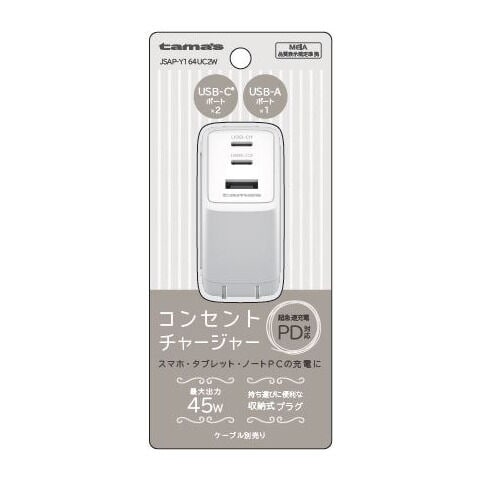 ◎多摩電子 PD45W コンセントチャージャー USB C×2+A(ホワイト)【Joshinオリジナルモデル】 tama's JSAP-Y164UC2W 【返品種別A】