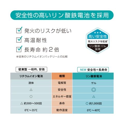 安全性の高いリン酸鉄電池を採用しています。