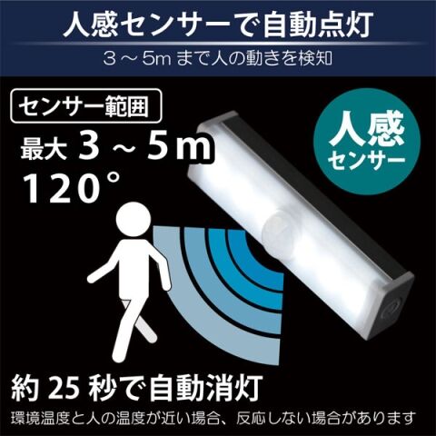 ※満充電時の目安です。実際の点灯時間は使用環境・状況によって異なります。 - 人感センサー:最大5m、120度