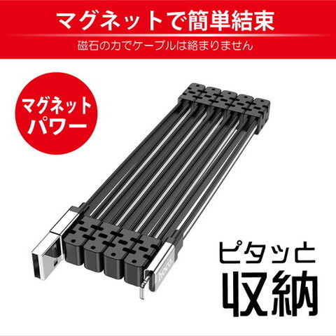 蛇腹状に折り畳まれたUSBケーブルは、マグネットにより簡単に結束してコンパクトに収納できます。ケーブルは約13cm間隔で纏まり、絡まることなくカバンなどにスッキリと収まります。