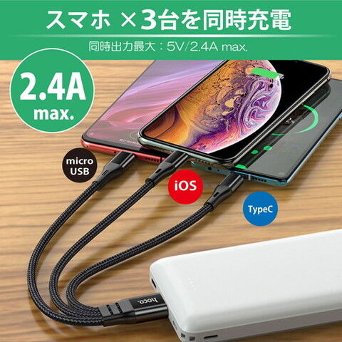 iOS、 Type-C、micorUSB、3本のケーブルの合計が最大5V/2.4Aまで対応しております。