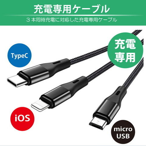 ◆iOS/Type-C/microUSB端子の3台の機器を同時に充電できる充電専用ショートケーブル