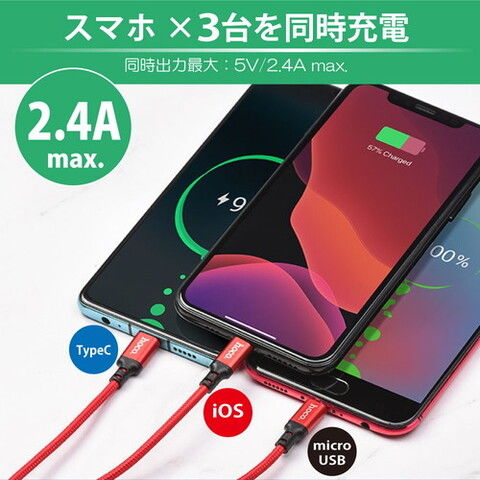 iOS、 Type-C、micorUSB、3本のケーブルの合計が最大5V/2.4Aまで対応しております。