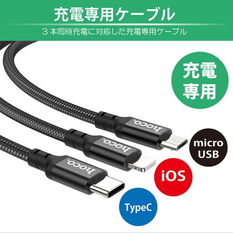 ◆iOS/Type-C/microUSB端子の3台の機器を同時に充電できる充電専用ケーブル