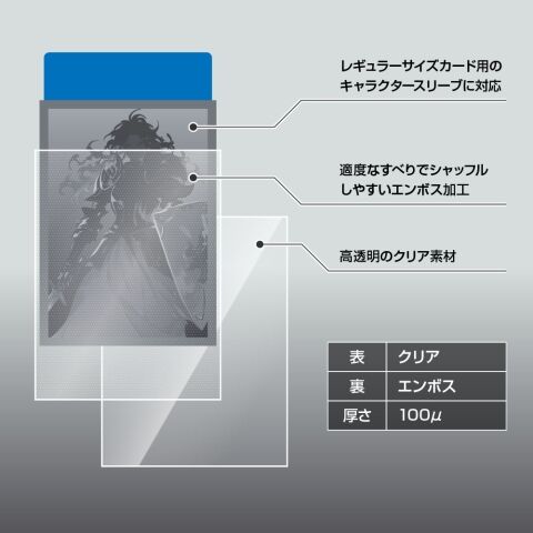 レギュラーサイズ(63×88mm)用キャラクタースリーブに重ねることができるスリーブで、カードとスリーブを傷や汚れから守ります。