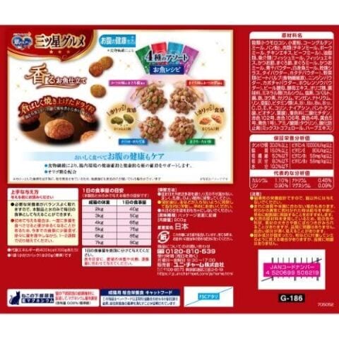 ■原材料:穀類(トウモロコシ、小麦粉、コーングルテンミール、パン粉)、肉類(チキンミール、ポークミール、チキンエキス、ビーフミール)、油脂類、魚介類(フィッシュミール、フィッシュエキス、かつお節、まぐろ節、まぐろミール、かつおミール、煮干パウダー、白身魚ミール、乾燥シラス、タイパウダー、ホタテパウダー)、野菜類(ビートパルプ(食物繊維源)、ニンジンパウダー、カボチャパウダー、ホレンソウパウダー)、ビール酵母、酵母エキス、オリゴ糖、調味料、ミネラル類(カルシウム、塩素、コバルト、銅、鉄、ヨウ素、カリウム、マンガン、ナトリウム、リン、亜鉛)、ビタミン類(A、B1、B2、B6、B12、C、D、E、K、コリン、ナイアシン、パントテン酸、ビオチン、葉酸)、着色料(二酸化チタン、赤色102号、赤色106号、黄色4号、黄色5号、青色1号)、アミノ酸類(タウリン)、酸化防止剤(ミックストコフェロール、ハーブエキス)