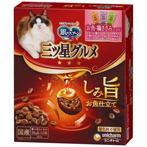 ユニ・チャーム 銀のスプーン 三ツ星グルメ しみ旨お魚仕立てお魚・鶏ささみレシピ 3種のアソート 16g×10袋 ミツボシシミウマサカナトリ3シユ160 【返品種別B】