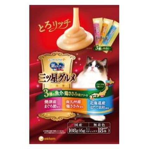 ユニ・チャーム 銀のスプーン 三ツ星グルメ おやつ 3種の魚介・鶏ささみ味アソート とろリッチ まぐろ節&鶏ささみ&ほたて貝柱使用 6g×18本 ミツボシオヤツ3シユササミ108G 【返品種別B】