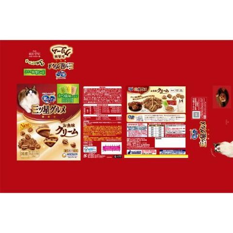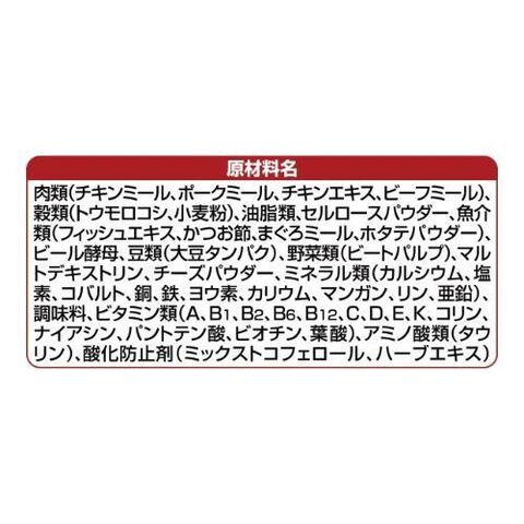 ■原材料:肉類(チキンミール、ポークミール、チキンエキス、ビーフミール)、穀類(トウモロコシ、小麦粉)、油脂類、セルロースパウダー、魚介類(フィッシュエキス、かつお節、まぐろミール、ホタテパウダー)、ビール酵母、豆類(大豆タンパク)、野菜類(ビートパルプ)、マルトデキストリン、チーズパウダー、ミネラル類(カルシウム、塩素、コバルト、銅、鉄、ヨウ素、カリウム、マンガン、リン、亜鉛)、調味料、ビタミン類(A、B1、B2、B6、B12、C、D、E、K、コリン、ナイアシン、パントテン酸、ビオチン、葉酸)、アミノ酸類(タウリン)、酸化防止剤(ミックストコフェロール、ハーブエキス)