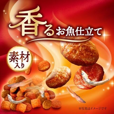 穀類(トウモロコシ、小麦粉、コーングルテンミール、パン粉)、肉類(チキンミール、ビーフミール、チキンエキス、ポークミール)、油脂類、魚介類(フィッシュミール、フィッシュエキス、かつお節、まぐろ節、乾燥小魚、まぐろミール、煮干パウダー、白身魚ミール、乾燥シラス)、ビール酵母、酵母エキス、かつお風味焼カマボコ、カニ風味焼カマボコ、白身魚焼カマボコ、ミネラル類(カルシウム、塩素、コバルト、銅、鉄、ヨウ素、カリウム、マンガン、リン、亜鉛)、調味料、ビタミン類(A、B1、B2、B6、B12、C、D、E、K、コリン、ナイアシン、パントテン酸、ビオチン、葉酸)、着色料(二酸化チタン、赤色102号、赤色106号、黄色4号、黄色5号)、アミノ酸類(タウリン)、酸化防止剤(ミックストコフェロール、ハーブエキス)