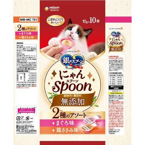 ユニ・チャーム 銀のスプーン 三ツ星グルメ おやつ にゃんSpoon 無添加2種のアソートまぐろ&鶏ささみ味 100g(10g×10本) ニヤンSムテンカ2マグロササミ100G 【返品種別B】