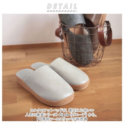 ◆コルクのフットベッドが、素足に心地いい。人気の雑貨シリーズ・Piede(ピエーデ)の、PU厚底ソールスリッパ。