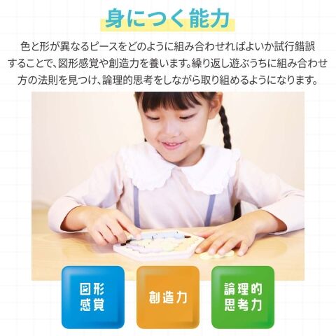 ●身につく能力:色と形が異なるピースをどのように組み合わせればよいか試行錯誤することで図形感覚や創造力を養います。