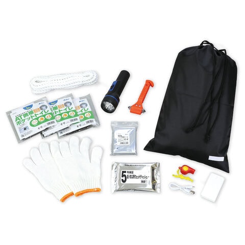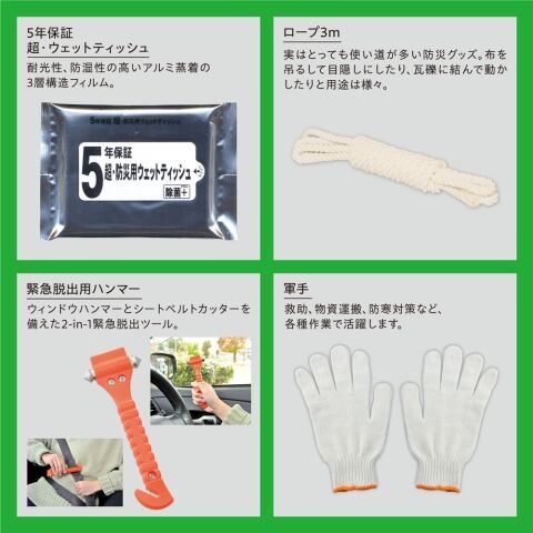 携帯トイレ×3、ウェットティッシュ×1、軍手×1組、脱出ハンマー×1、ロープ3m×1